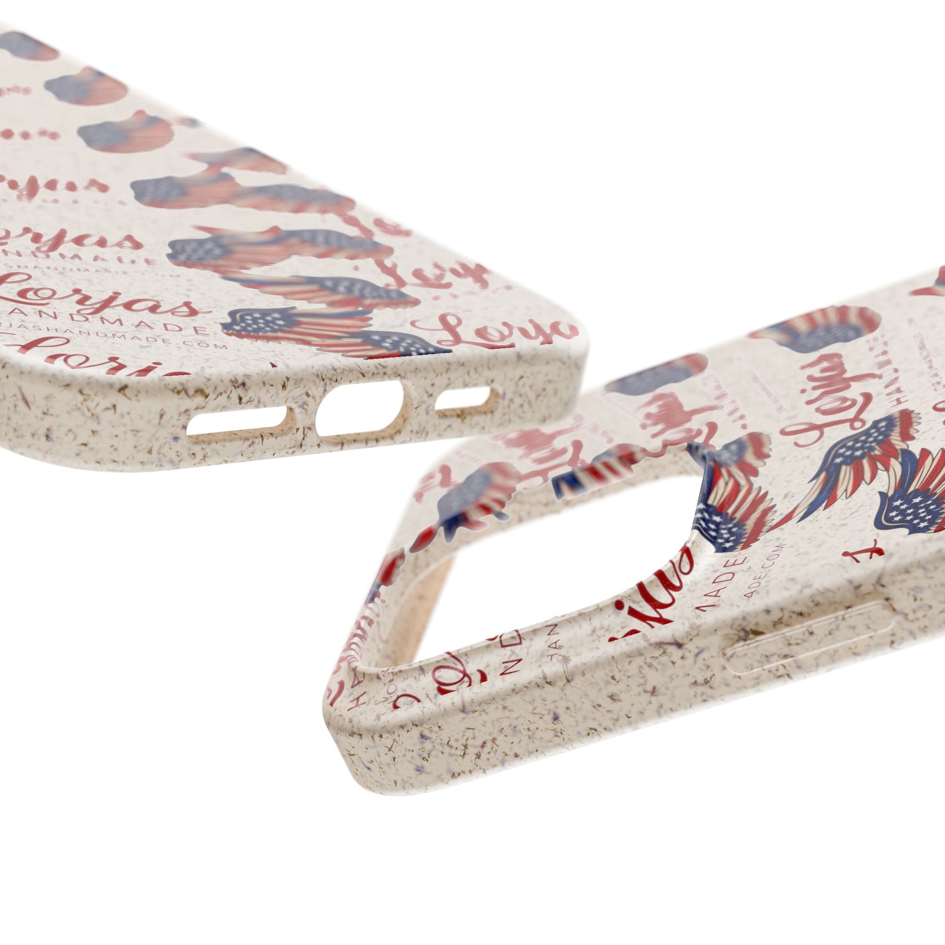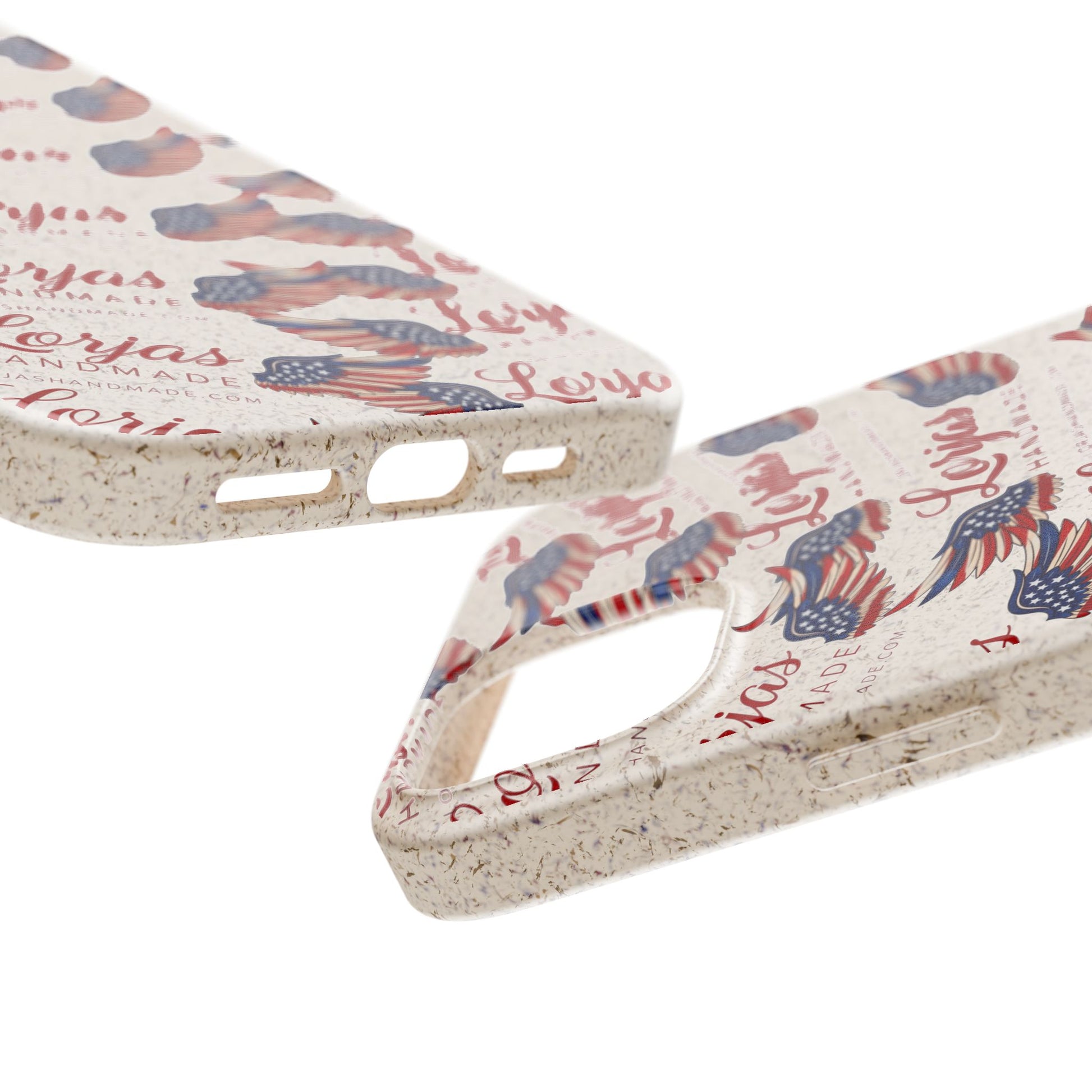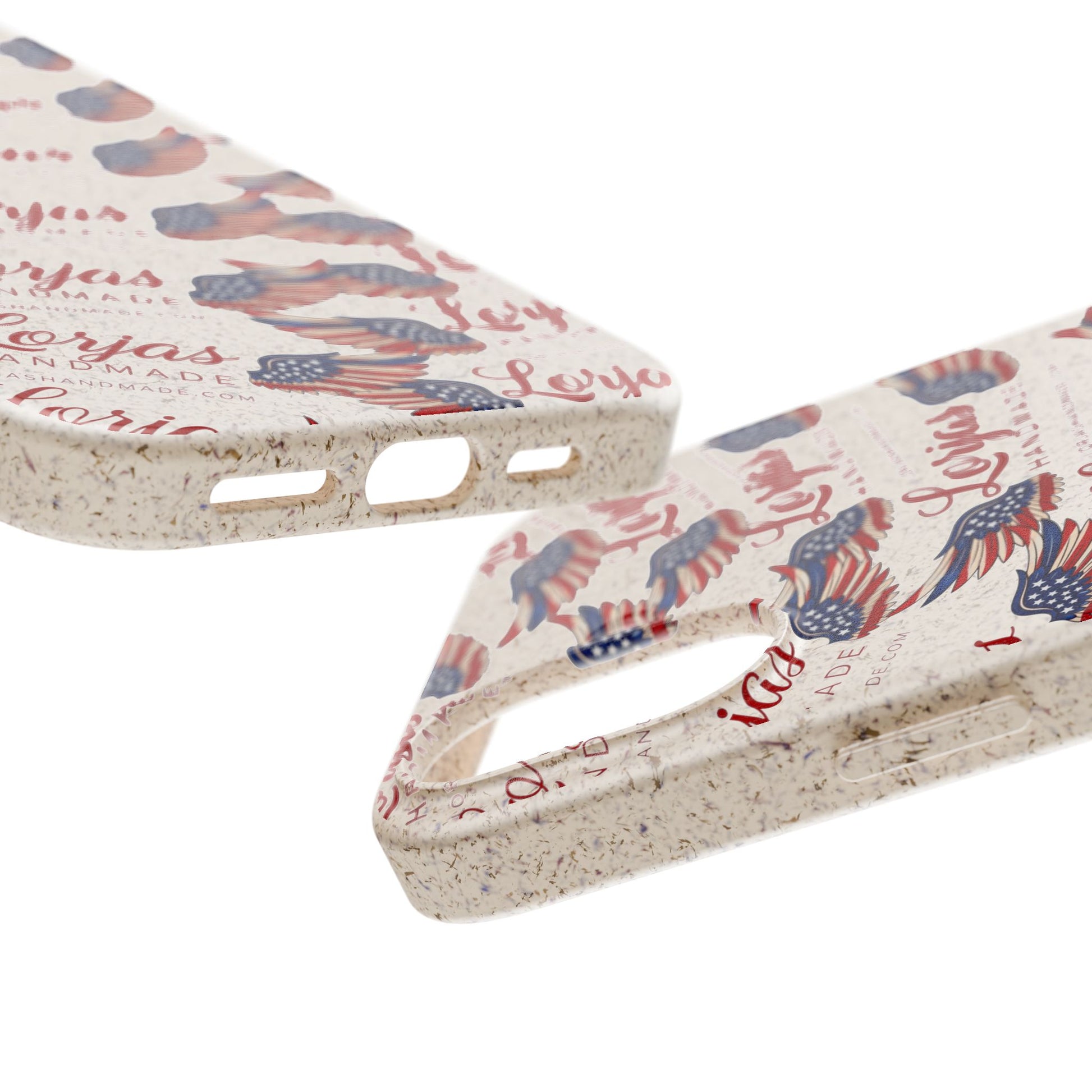 Lightweight, plant-based protection with personality. This biodegradable phone case wraps your device in a smooth, matte finish printed with a vintage-inspired Americana pattern — fluttering flag motifs and hand-lettered script on a warm, natural background. It feels slightly textured to the touch, flexes to absorb everyday bumps, and slips easily into pockets. The case supports MagSafe® wireless charging when aligned, includes precise cutouts for ports and cameras, and brings a subtle, natural scent from its bamboo blend. Made from PLA and PBAT polymers with bamboo fibre, it’s fully compostable at the end of its life and carries a quietly crafted, small-batch vibe.